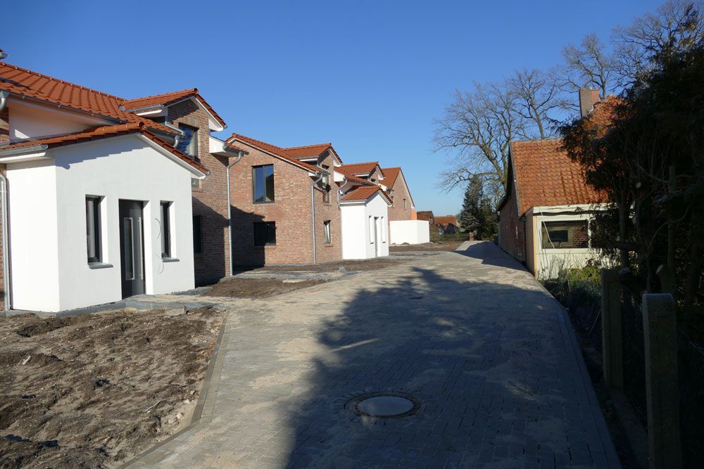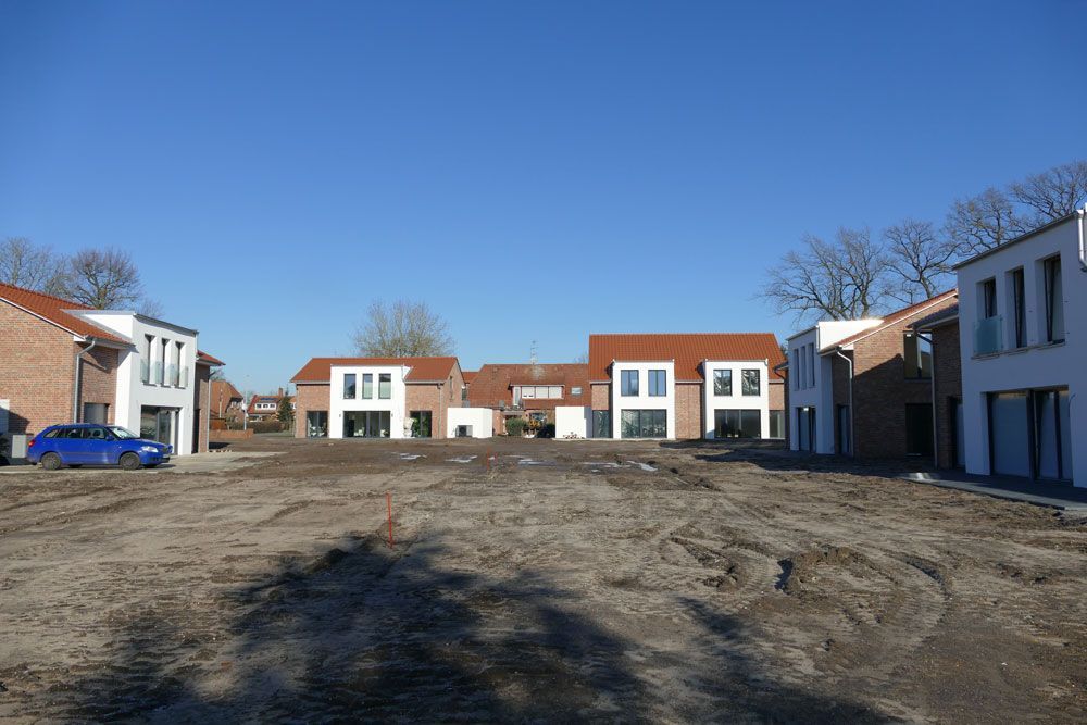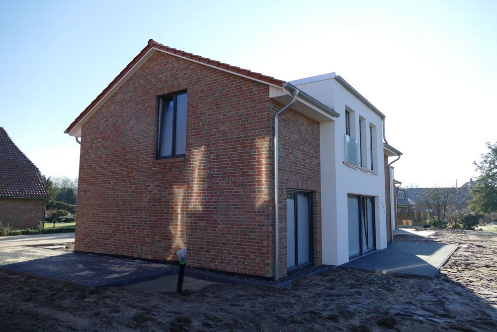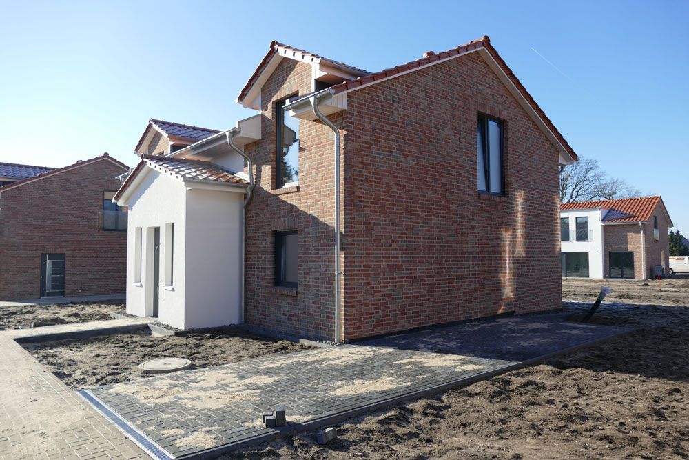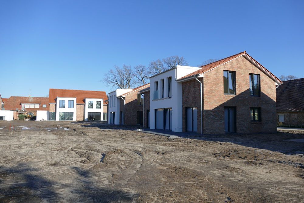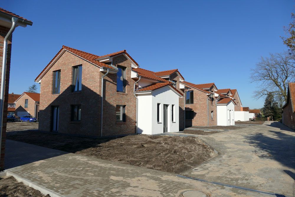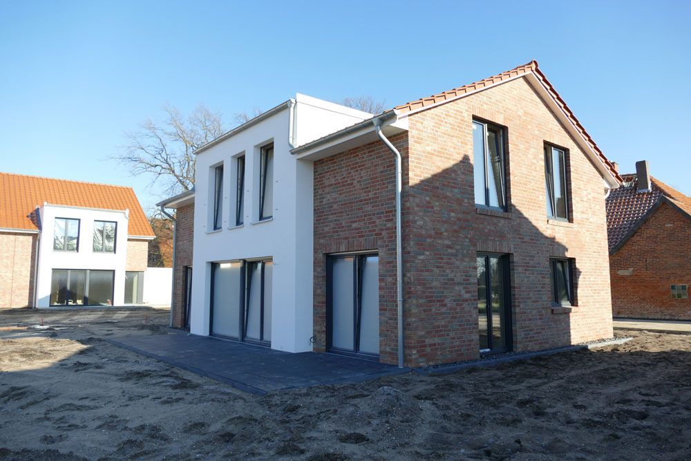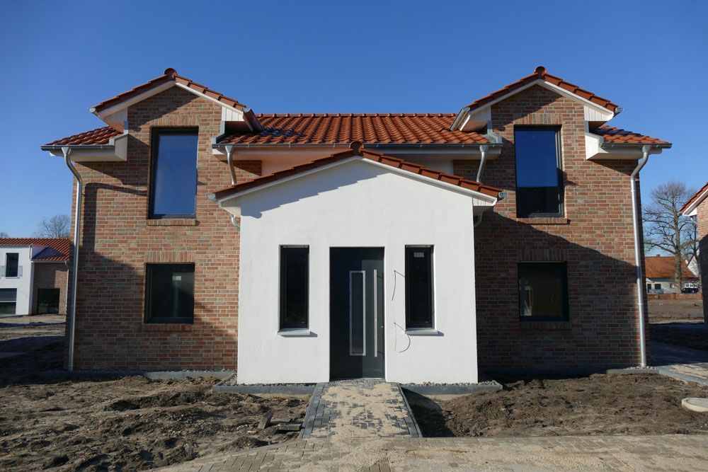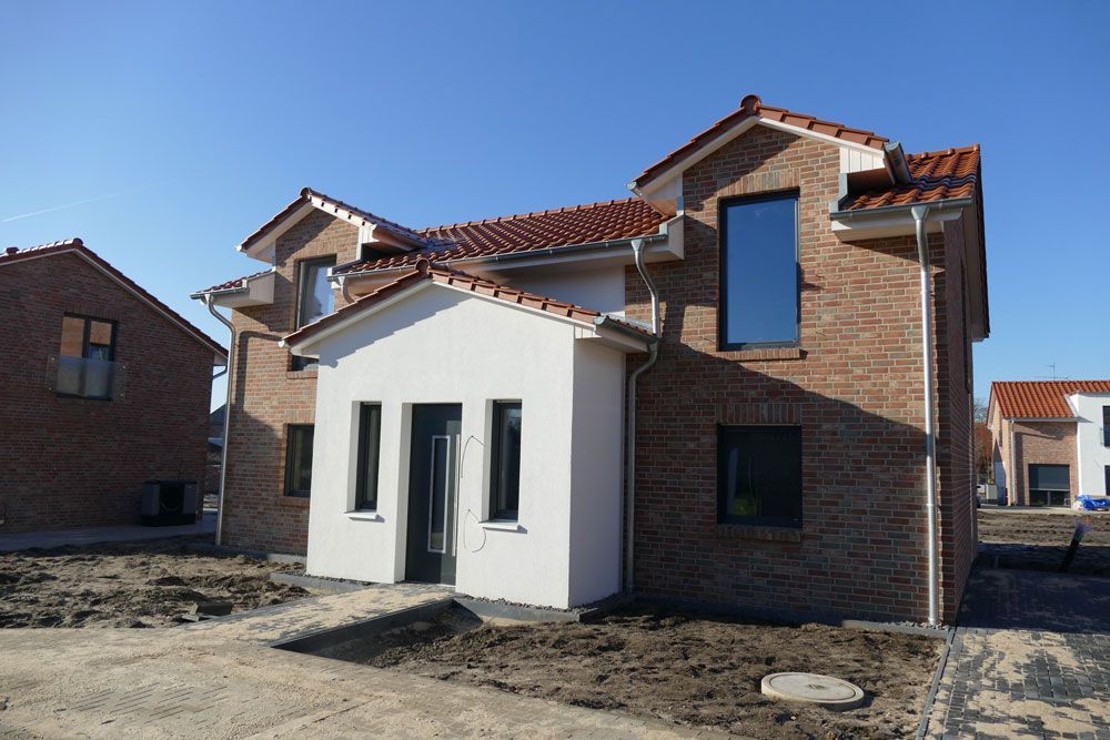 In Scharrel, einem Ortsteil in Neustadt a Rbge, entstehen 7 schlüsselfertige Einfamilienhäuser in Massivbauweise. Durch die Ausbildung eines Harzer Daches erhalten die Häuser eine besondere Ausstattung, die den Dämmstandard erhöht. Große Teile werden mit einem roten Klinker verblendet, während der vorspringende Bereich in WDVS aus hochwertiger Steinwolle gefertigt wird.