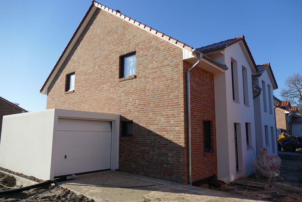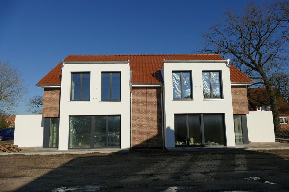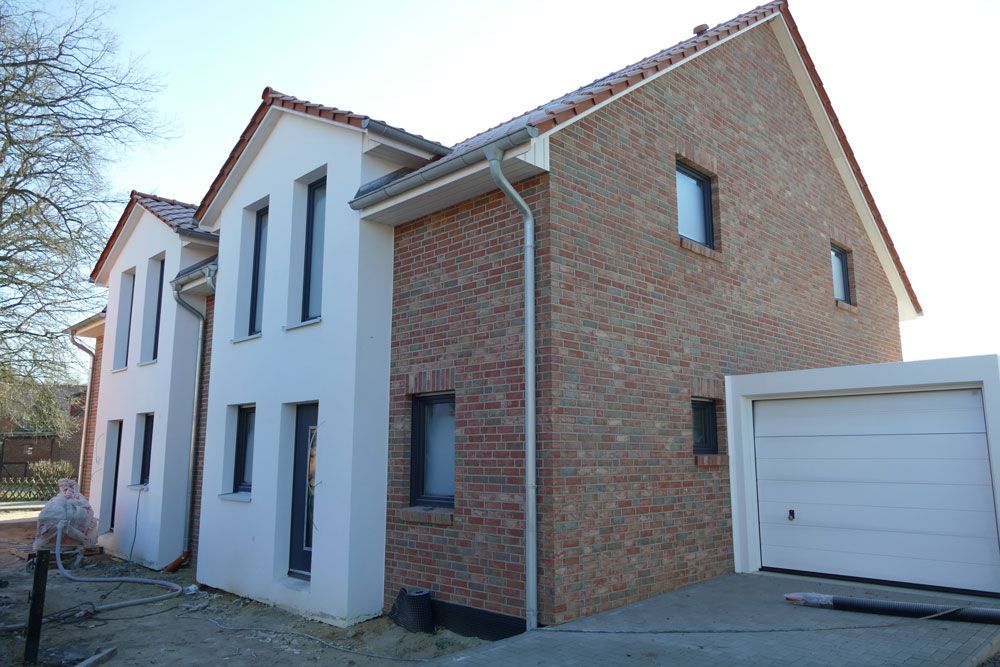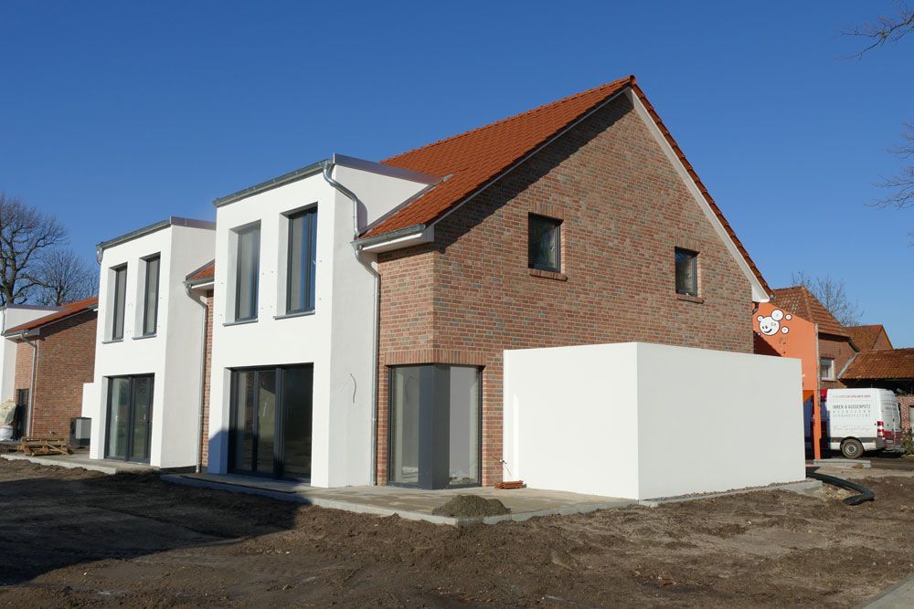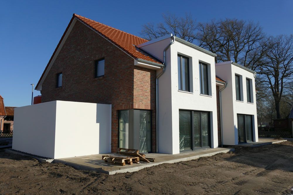 Hier entsteht ein Doppelhaus in Massivbauweise. Durch die Ausbildung eines Harzer Daches erhalten die Häuser eine besondere Ausstattung, die den Dämmstandard erhöht. Große Teile werden mit einem roten Klinker verblendet, während der vorspringende Bereich in WDVS aus hochwertiger Steinwolle gefertigt wird.